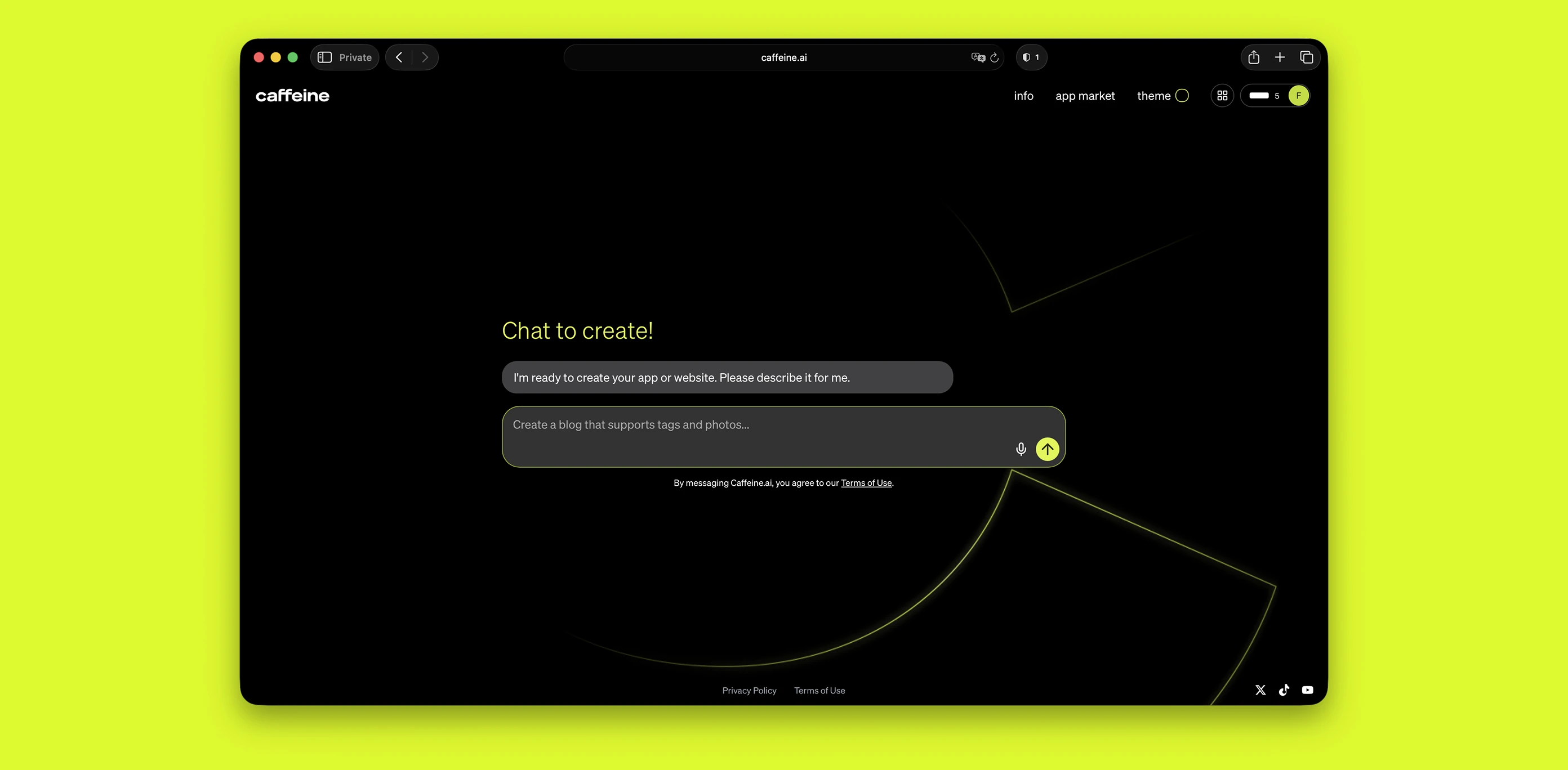 Caffeine is an online platform that makes it possible to create and maintain successful apps and websites, simply by chatting with AI. Because only chat is required, Caffeine is a platform for "self-writing apps."